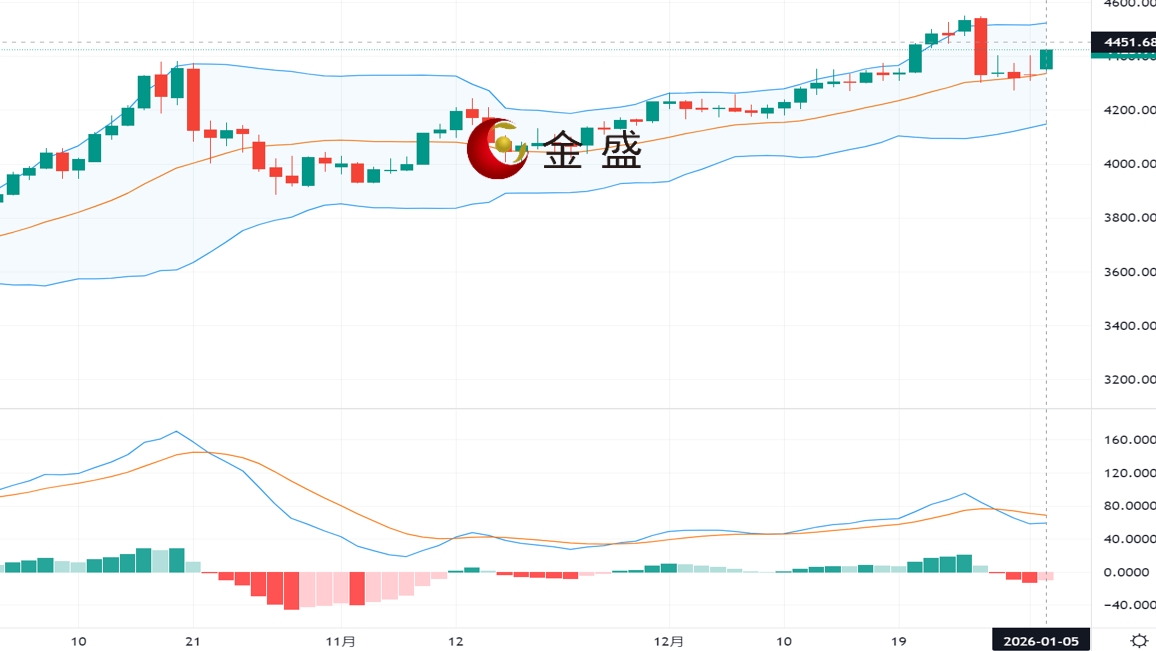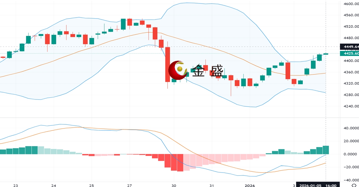 从四小时图来看,现货黄金上一交易日自高点4402美元回落,周末委内瑞拉局势推动了避险情绪,今日早间因为周末的消息数据刺激,开盘价格出现跳空高开并一度上涨,当前金价最高已反弹至4429一线,暂时在4430一带承压。基本面避险主导行情走势,黄金大起大落宽幅震荡。指标macd金叉放量运行,利多看涨上升,布林带向上开口运行,已经突破多个关键压力,操作上不建议直接追涨,回踩做多为主,上方关注4440-4450区间阻力,下方关注4340-4330区间支撑。