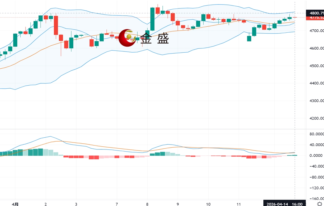 从日线图来看,现货黄金上一交易日先受美伊谈判未达成协议影响而大幅低开,但随后行情回升反弹回补跳空缺口至4740附近,日线最终报收中等实体阳柱。价格站稳布林带中轨上方,短期均线拐头向上,多头信号明确。MACD指标绿柱持续缩短、即将形成金叉,日内重点关注上方4800附近争夺,若能继续突破,将为其进一步上行打开空间。
