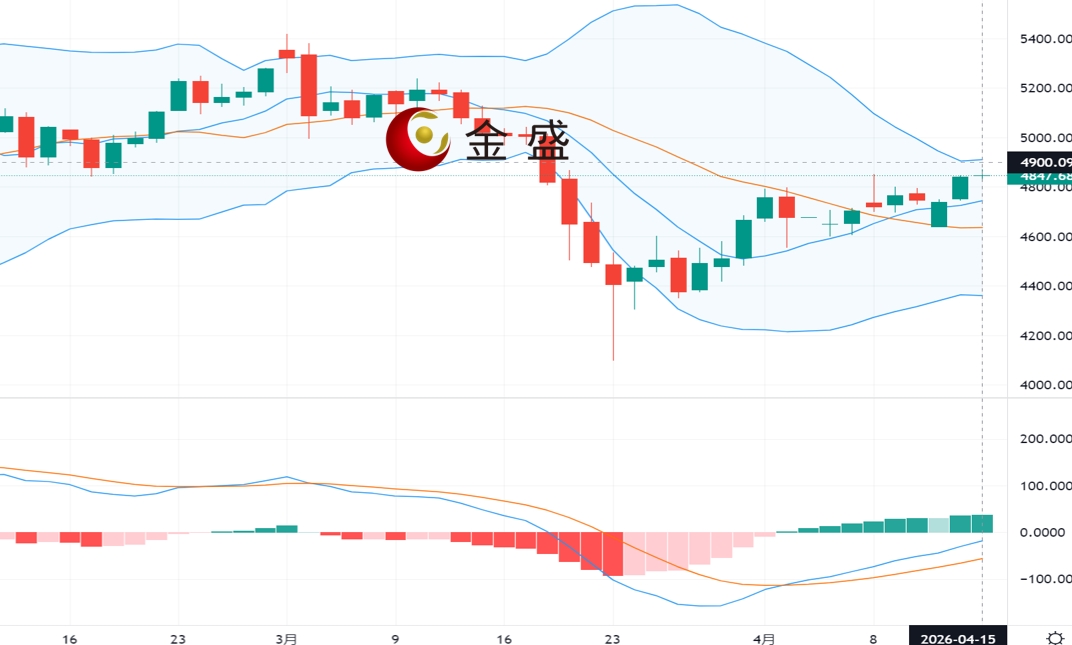 现货黄金上一交易日在4760美元上方持续震荡盘整后,美盘时段多头再度发力,连续反弹走强,于盘尾录得日内高点4846美元,日线最终以一根略带影线的饱和大阳线收线。黄金延续回升之力反弹走强,成功站稳均线上方,MACD金叉,红柱持续放量,布林带开口,K线继续维持较好的震荡上行走势,短期多头动力偏强,操作上建议回撤做多为主。上方关注4900-4930区间阻力,下方关注4800-4780区间支撑。