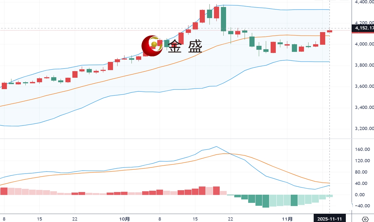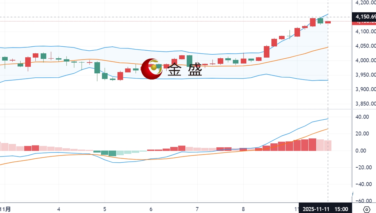 现货黄金周二(11月11日)开市于4115.39美元/盎司,盘中延续前一日涨势,维持在4130美元附近,创下近两周新高。近期市场押注明年美联储将提前降息,12月降息 25个基点概率已升至 67%,明年1月进一步升至约 80%。在降息预期与美元走弱的共同支撑下,黄金突破两周高点,尽管美国政府关门风险缓解削弱部分避险需求,但短线多头动能依旧强劲。