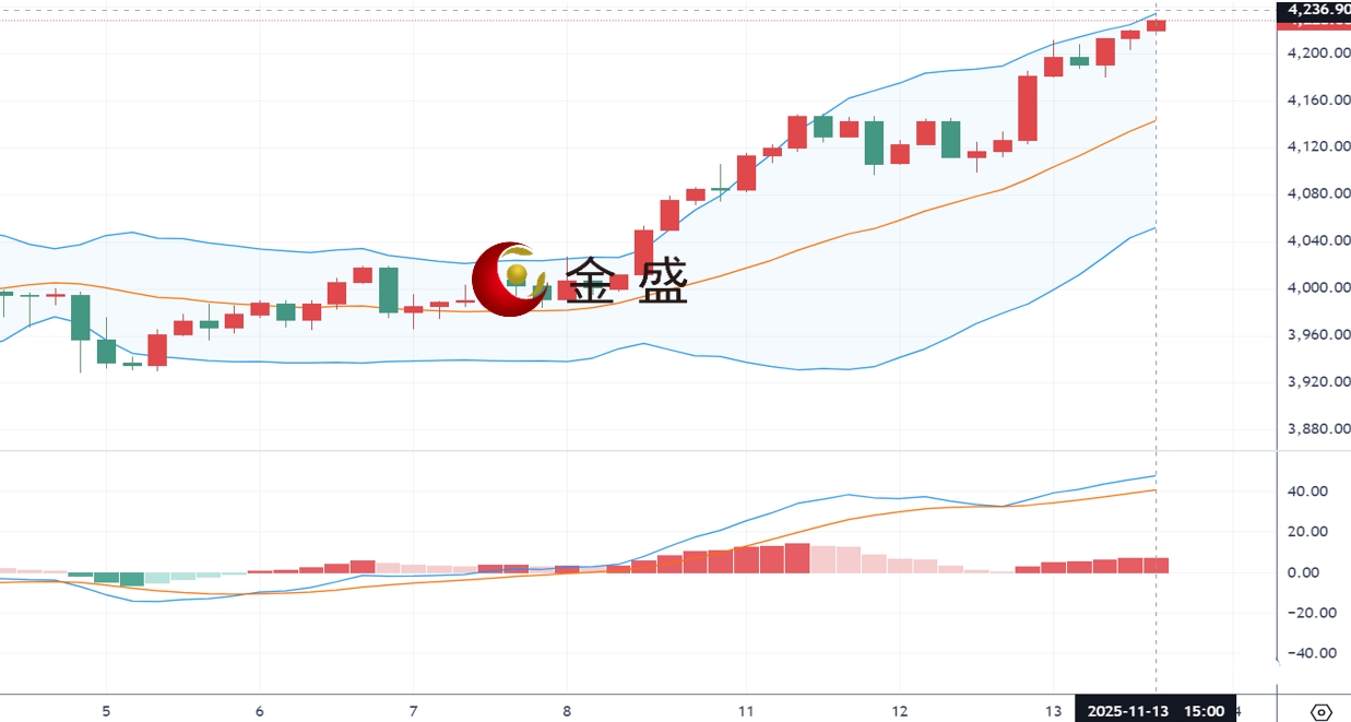 从日线图来看,现货黄金上一交易日强势单边拉升113美金,最低触及4098后一路冲高至4211,最终收稳4200关口,日线报收一根带下影线的中等实体阳线,高点逐步抬高,日K均线金叉,金价在布林中轨上方运行,MACD金叉开始放量,今日周四,早盘黄金延续前一日尾盘的上涨,再度拉升破高触及4230区域,多头强势延续不断刷新高,大周期来看黄金多头还是很强,继续维持多头趋势看涨。