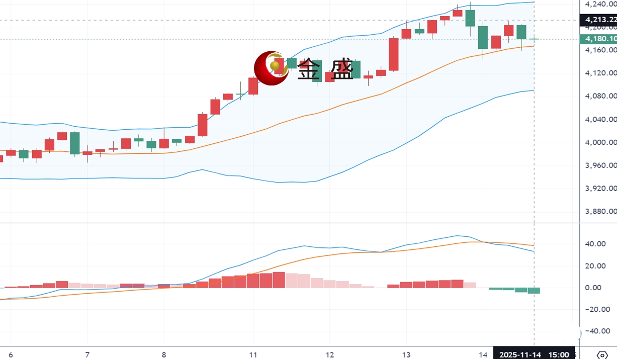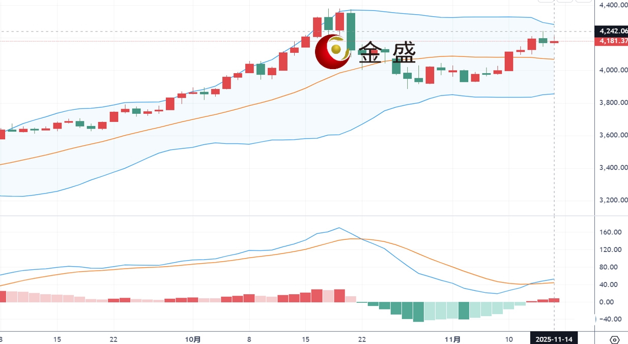 现货黄金周五(11月14日)开市于4171.18美元/盎司,盘中一度上涨近1%,触及每盎司4211美元附近,随后高位回落。美元持续走弱与地缘政治紧张局势共同提升黄金吸引力,但美联储官员近期鹰派言论抑制了市场对12月降息的预期,限制了金价上行空间。