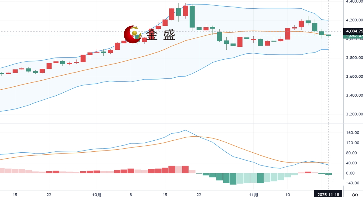现货黄金周一(11月17日)亚市早间开盘于4082.49美元/盎司,最高4106.79美元/盎司,最低4006.82美元/盎司,收盘4045.76美元/盎司,全天波幅约100美金,当日跌幅约0.96%。
