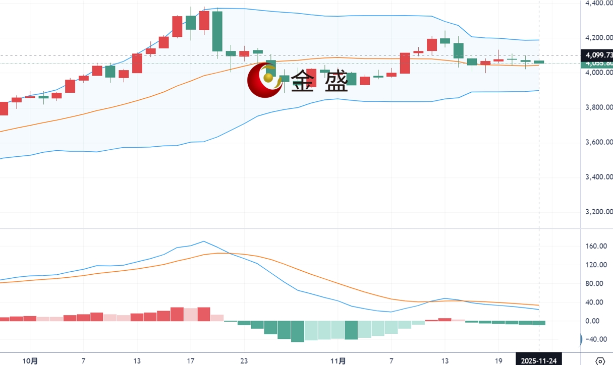 现货黄金上周五(11月21日)亚市早间开盘于4074.48美元/盎司,最高4101.22美元/盎司,最低4022.03美元/盎司,收盘4064.90美元/盎司,全天波幅约79美金,当日跌幅约0.3%。