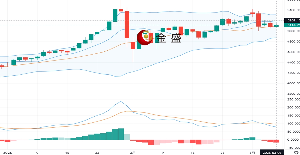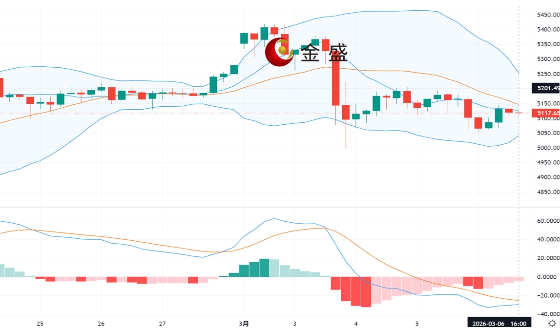从四小时图来看,现货黄金上一交易日在最低触及下方5050新一轮的低点后开始走震荡反弹,今日早间黄金震荡后拉伸逾70美金,目前交投于每盎司5142美元附近,布林带收口,在5050反弹后形成反转形态,价格持续承压于布林带中轨下方,短期上行势头受阻,晚间重点关注美国非农数据,上方5200仍面临强压,若无法有效升破,多单可离场,稳健者建议保持观望。