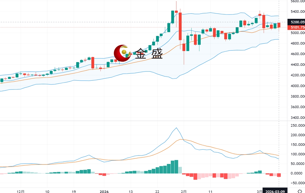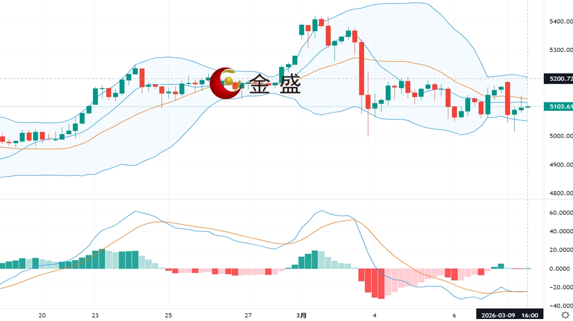 从日线图来看,现货黄金上一交易日白盘时段最低下探5062一线后震荡走高,美盘时段受非农就业数据利多影响金价震荡上行,最高上探5174一线后小幅回落,日线最终录得阳线。今日早间黄金开盘小幅拉伸临近5200关口,呈现快速回落走势,布林带收口,k线在布林中轨附近,黄金目前处于调整结构,并维持在箱体震荡中。早盘高开之后并没有延续上涨,而是出现慢跌,当前价格逼近5000美元关键整数关口,短期空头动能占优,市场风险显著上升,需警惕破位风险。