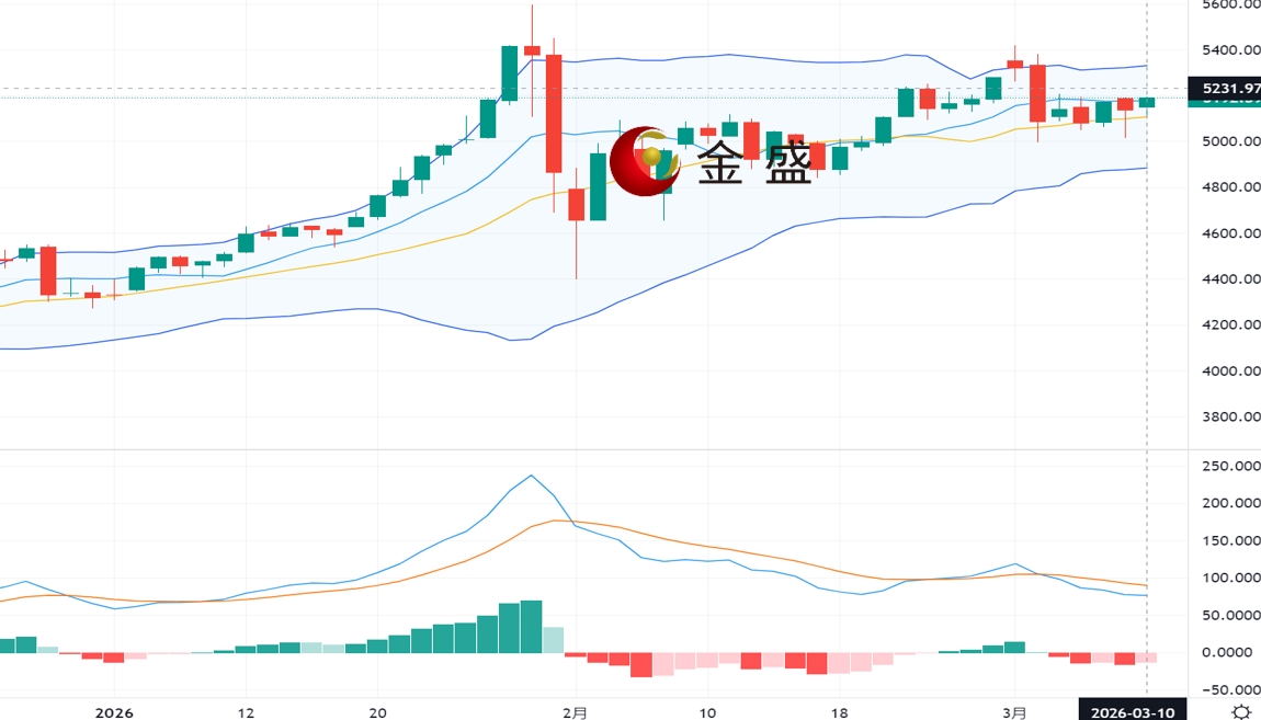 从四小时图来看,现货黄金上一交易日最低下探至5060,随后因特朗普表态美国将很快结束对伊朗的战事冲突,金价迎来一波反弹,总体呈现先抑后扬的V型走势。今日早间黄金快速探底出现反弹,但仍未摆脱5000-5200区间震荡格局,当前macd零轴附近金叉,技术面显示黄金短线偏向上行,但未能突破关键阻力区域5200美元/盎司,布林带收窄,整体走势上还是维持在区间震荡,在正式有效突破前,可延续区间内高抛低吸的思路。上方关注5200-5230区间阻力,下方关注5050-5000区间支撑。