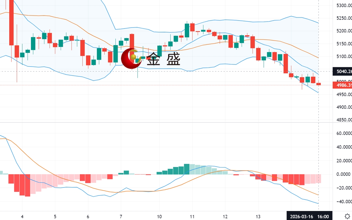 从日线图来看,现货黄金上一交易日在欧盘破低之后,美盘反弹5120附近再次下跌,最低跌至5010附近后震荡收盘,最终收取一根上影线较长的中阴,日线三连阴,破位布林中轨的支撑,布林带三轨走平,macd死叉缩量震荡下跌,今日早盘黄金低开低走,最低下探4966附近,黄金跌破前期的联排支撑带之后,K线继续承压短周期均线维持在震荡偏弱走势,短期关注5030一带的压力带。