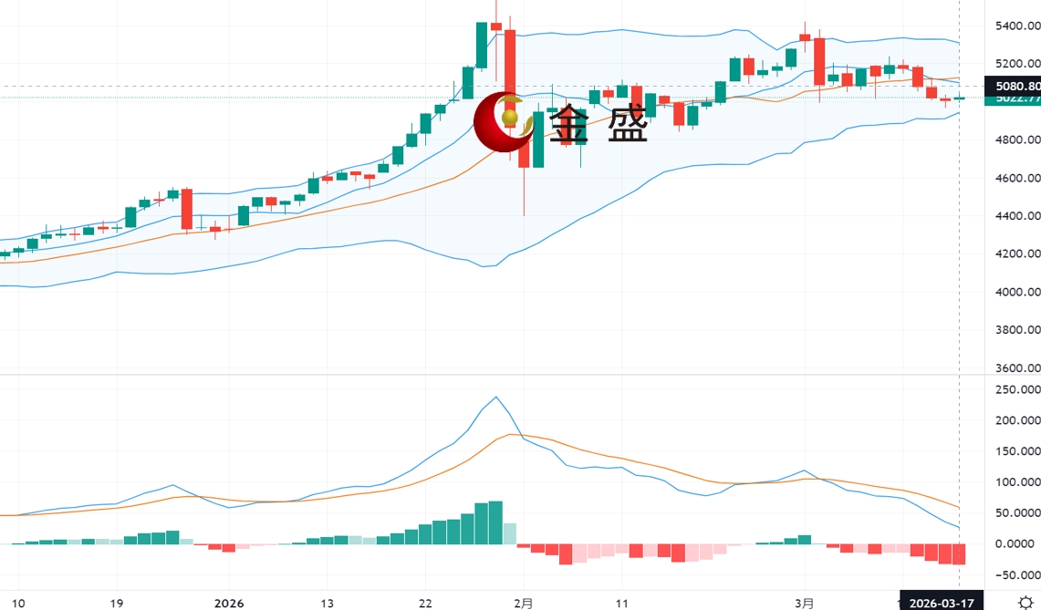 现货黄金周二(3月17日)开市于4986.89美元/盎司,盘中小幅上涨,但未能有效突破5050美元关口,多头信心不足。随着美以冲突延伸至黎巴嫩南部,针对真主党控制地区的地面攻势加剧,地缘避险需求仍然支撑黄金价格。黄金在地缘风险支撑下维持窄幅震荡,但高油价带来的通胀压力及美元暂时支撑限制黄金上行动能。短期内,价格可能在5000-5050美元区间调整,等待美联储及其他主要央行的政策信号。