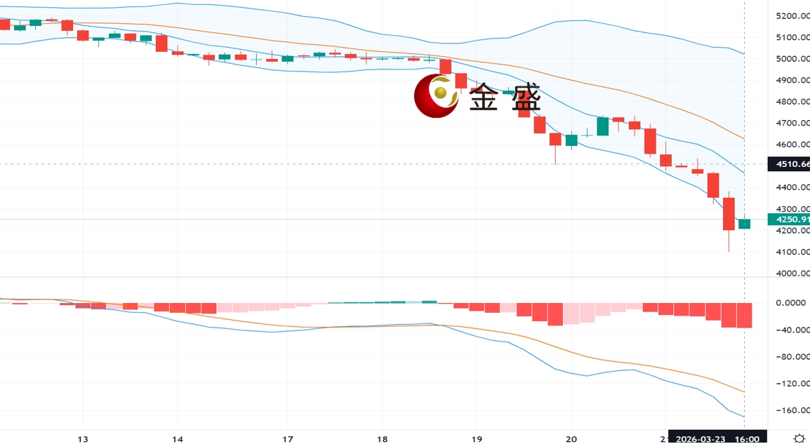 从四小时图来看,现货黄金上一交易日大幅收跌,连续三个交易日持续走低,今日早间黄金在低开后快速向上反抽至4536附近后走回落,目前最低到了4100一线,短期均线呈空头排列,MACD指标处于零轴下方,空头动能仍在释放,价格运行于布林带下轨附近,以反弹承压、惯性探底为主,操作思路建议反弹顺势高空为主,上方重点留意4300-4330区间阻力,下方关注4100美元支撑得失,若该位置一旦失守住,可能会进一步跌到4000美元关口。