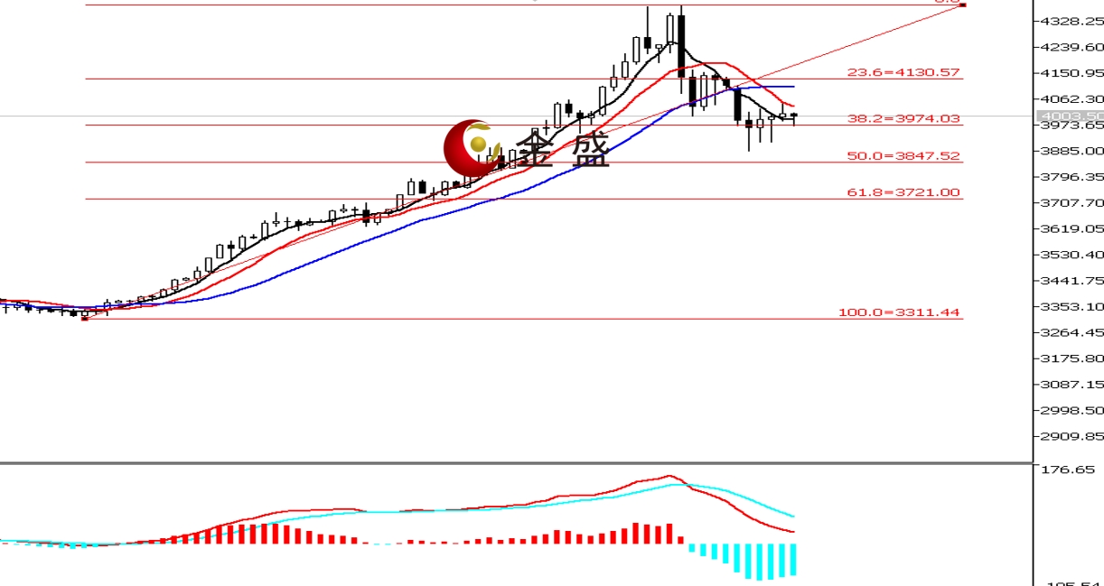 日线图,黄金周一下挫逾3%,周二创当周低点,随后三日震荡偏反弹,多空围绕四千关口争夺。均线系统不断收敛,运行在价格上方形成压力。MACD快慢线零轴上方现死叉,做空的动能为主。黄金中长期上行趋势不变,短期进入高位的休整。价格连续两周下行,回调空间不及前一波上行的50%。周内价格围绕3900美元一带出现两次V型反弹,可见此处的支撑强劲。行情高位的第一波调整或已结束,短期偏向针对近两周调整的反抽,操作上低吸为主。