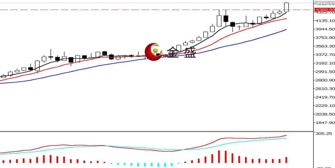 日线图,周一黄金单边上行站上4400美元关口,周五随着白银单日大涨逾10%,黄金跟随上行收盘站上4500美元大关。均线系统拐头向上,对价格形成支撑。MACD指标快慢线零轴上方现金叉,做多的动能增强。黄金上行趋势不变,价格刷新历史新高。金银频频暴涨之际,CME已再度出手上调保证金。市场分析人士指出,此举反映了交易所对当前贵金属市场异常波动风险的深度担忧。当交易所开始密集通过提高保证金来限制杠杆时,往往是市场逆转的前兆。