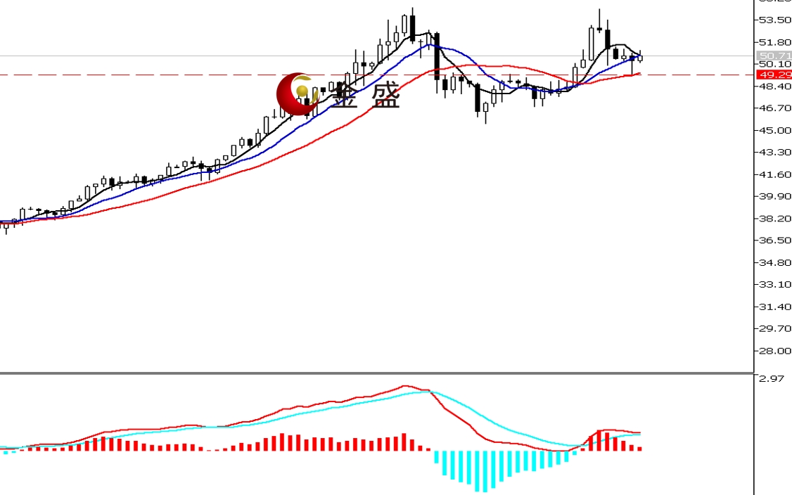 前一个交易日,白盘时段,黄金承压50美元一带震荡下行,午后创当日低点49.3美元止跌转涨,多头快速反扑走V字型。晚盘时段,行情延续反弹,价格接连打破50、51美元大关,尾盘创当日高点51.13美元,最终收小阳线。均线系统不断收敛,布林带中轨对价格反弹形成支撑。MACD指标快慢线零轴上方现金叉,做多的动能减弱。白银在回调的第四日反弹收阳,价格正好回踩底部盘整结构的上轨49.2美元一带,也是布林带中轨附近。近两日出现联排下影线有一定的止跌信号,短期关注反弹高度,价格只有突破51.3美元一带,反弹空间才能打开。