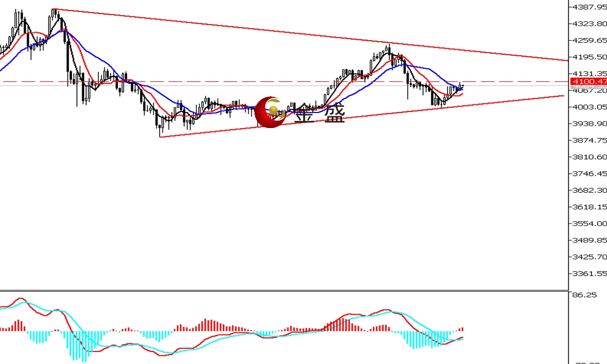 现货黄金周三(11月19日)开市于4067.22美元/盎司。亚欧盘时段,美指承压昨日高点窄幅休整,日内波动不足二十个点。黄金延续反弹逼近4100美元附近,午后围绕此关口徘徊。截止目前,金价最高4098.33美元/盎司,最低4055.64美元/盎司。黄金回踩下方趋势线止跌收阳,确认四千关口支撑有效。行情高位震荡构成收敛三角形结构。周内走势形成尖底结构,4100美元一带是多空分水岭,行情需强势突破此关口,后市才看三角形的上轨压力(4180美元附近)。