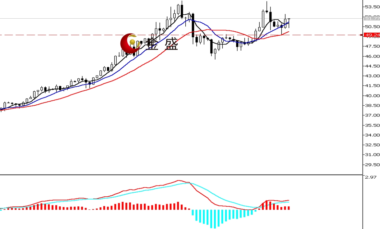 前一个交易日,白盘时段,银价短暂休整后继续上行,午后一小时拉升逾1%,价格冲上52美元大关,创日内高点52.42美元。晚盘时段,行情拐头下行,盘中一小时下挫1%,多头回调日内全部涨幅,价格最低至50.32美元,尾盘有所反抽,最终收长上影的阳线。均线系统不断收敛,布林带中轨对价格反弹形成支撑。MACD指标快慢线零轴上方现金叉,做多的动能减弱。白银连续两日反扑,昨日上行有加速的迹象,但价格冲高回落,多头情绪暂时受挫。短期关注价格是否能持续守住51美元关口。
