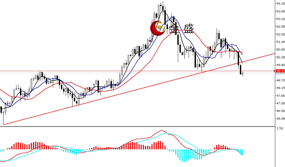 前一个交易日,白银早盘短暂上,随着拐头震荡下行,小时图形成下降三角形结构,最终收跌1.43%。今天白盘行情单边下挫,价格接连跌破50、49关口,午后最大跌幅逾3%。四小时周期,均线系统空头排列,压制价格反弹。MACD指标快慢线零轴下方现死叉,做空的动能为主。白银跌破图示的上涨趋势线,价格刷新周内新低,技术形态类似圆弧顶结构。短期关注49美元关口的得失,操作上高抛为主。