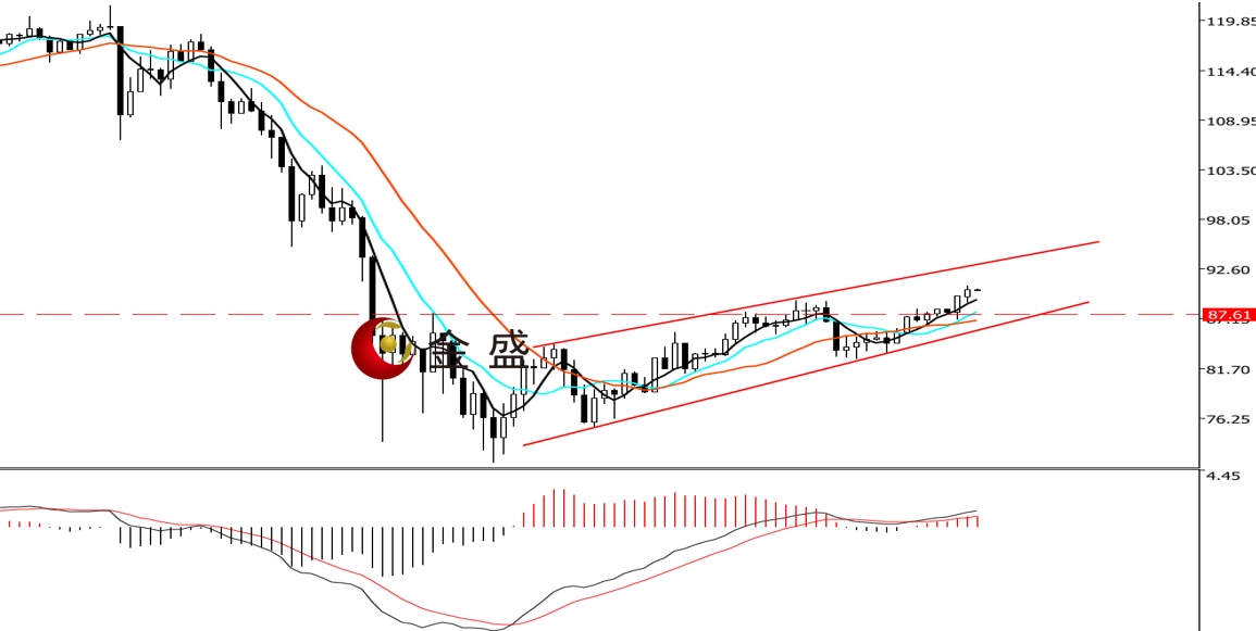前一个交易日,白银走势与黄金类似,行情持续反扑,盘中涨幅超10%,价格逼近90美元一带,日图收中大阳线。今天日内行情上行势头减慢,但价格稳步上行,创周内新高。小时图,均线系统收敛向上拐头,运行在价格下方形成支撑。MACD指标快慢线零轴附近现金叉,做多的动能为主。白银在暴跌后迎来反弹行情,多头突破低位盘整结构,确认反弹空间升级。走势可能形成图示的楔形结构,短期关注形态上轨93美元一带的压力反应,操作上高抛低吸。