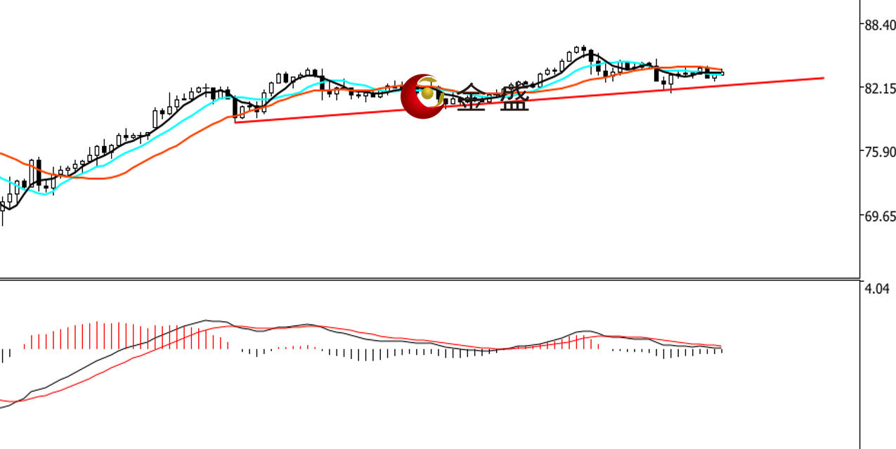 前一个交易日,非农数据公布前,行情持续拉升至86美元一带。晚盘基本面利空,银价回吐部分涨幅,最终收涨逾4%。今天早盘行情延续调整,午后收复部分日内跌幅。小时图,均线系统不断收敛,价格围绕其震荡。MACD指标快慢线零轴附近走平,做空的动能为主。白银延续反弹,多头势能有所减弱,价格震荡的高低点维持上行,即周内的上涨结构不变。80美元一带是多空分水岭,价格未有效跌破前,操作上回调做多为主。