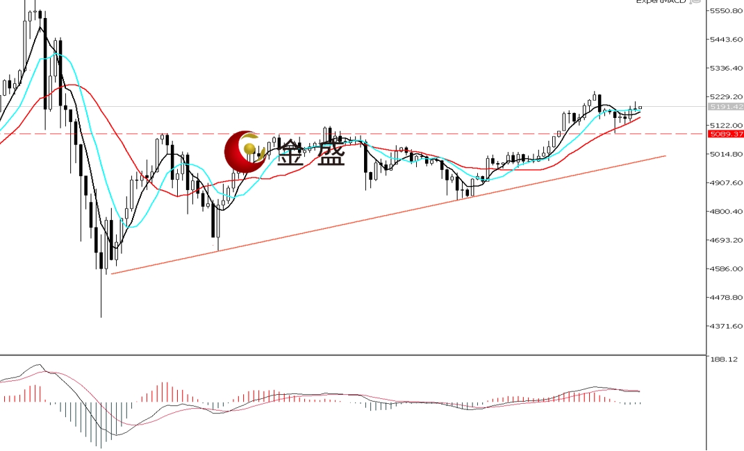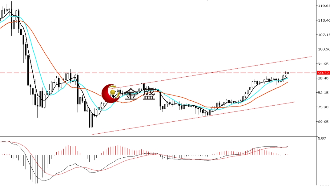 前一个交易日,金银走势出现分化,黄金以调整为主,白银大部分时间以区间震荡为主,盘中再次回踩85美元一带止跌反弹,最终收小阳线。今天白盘行情延续上行,午后突破90美元大关。四小时图,均线系统多头排列,运行在价格下方构成支撑。MACD指标快慢线零轴下方现金叉,做多的动能为主。白银延续箱体内震荡,价格来到区间上轨附近,短期关注能否有效突破,一旦站稳箱体上轨,则反弹空间升级,后市可能形成图示的上行通道。操作上高抛低吸。