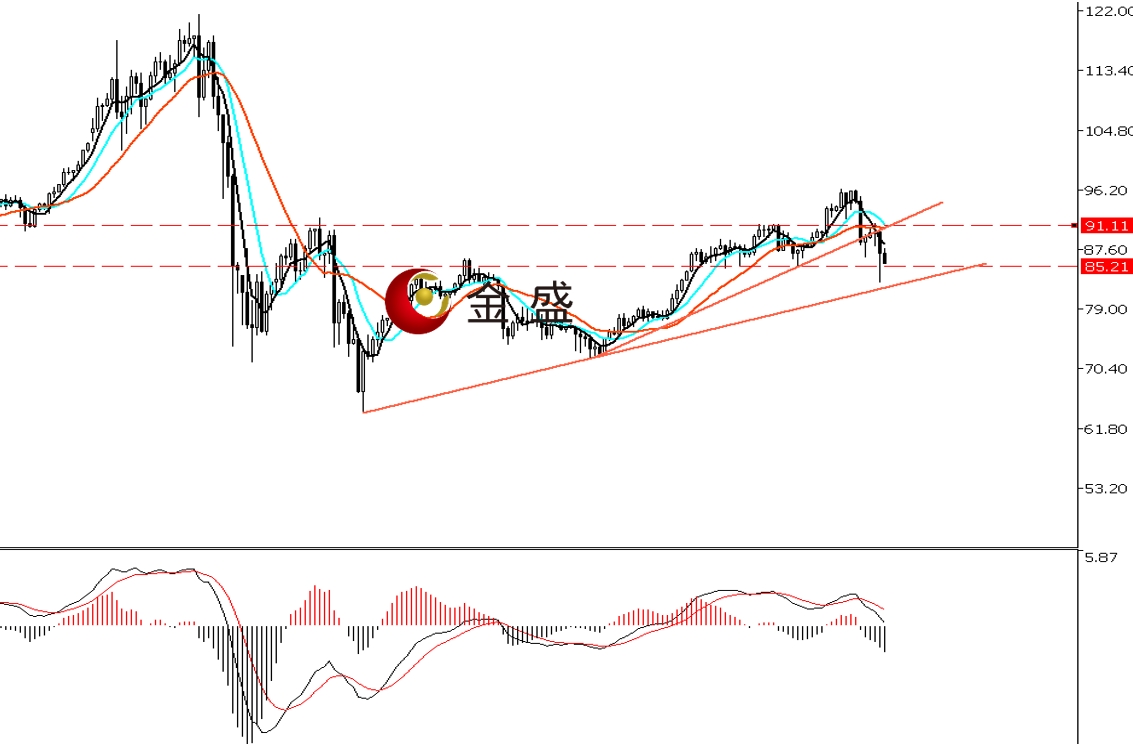 前一个交易日,避险资金流入白银的意愿不强,价格早盘就跌破开盘价,晚盘大幅下挫失守90美元关口,日图收中阴线。今天日内继续震荡下挫,价格一度跌破上周低点。四小时图,均线系统拐头向下,运行在价格上方形成压力。MACD指标快慢线零轴上方现死叉,做空的动能增强。白银在90美元一带形成假突破,价价格持续调整跌破上周趋势线,85美元一带是趋势分水岭,一旦破位,则后市调整进一步扩大。操作上反弹博空为主。