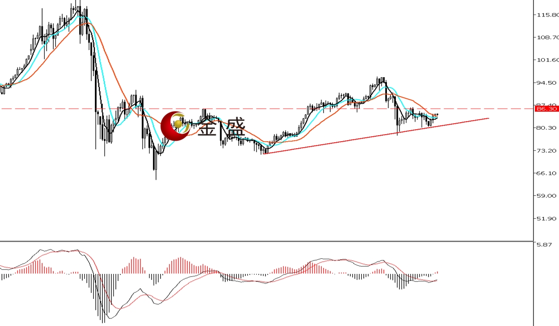 前一个交易日,白银坚守80美元大关,价格震荡偏调整,最终收跌逾1%。今天日内震荡上行,多头收复昨日美盘全部跌幅。四小时图,均线系统不断收敛,价格围绕其震荡。MACD指标快慢线零轴下方现金叉,做多的动能增强。白银低点形成图示的支撑线,昨日回踩后有反抽。86美元一带形成多空分水岭,短期不能突破,则偏向继续调整,操作上高抛为主。