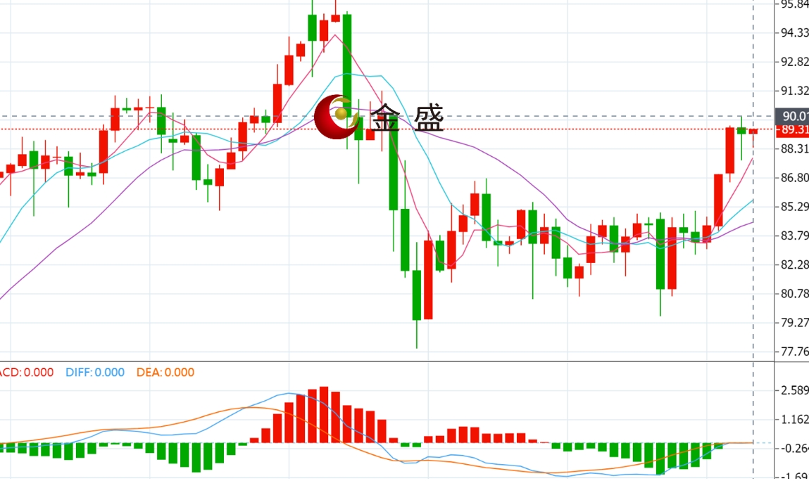 前一个交易日,金银走势分化,白银反弹力度更强。价格早盘跳水,随后持续反弹走V型结构,最终收十字星。今天日内行情进一步上行,价格突破上周盘整结构。四小时图,均线系统拐头向上,运行在价格下方形成支撑。MACD指标快慢线零轴附近现金叉,做多的动能为主。中东紧张局势有所降温,利好白银的工业属性。行情走出近几日的整理箱体,根据最小目标原则,价格将测试90上方的压力。短期关注此关口的承压信号,操作上出现反转信号博空为主。