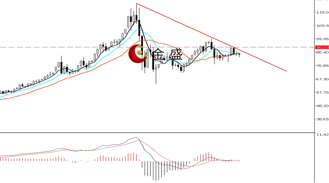 前一个交易日,白盘时段,银价围绕85美元一带休整数小时,午后向上突破区间,扩大日内反弹空间。晚盘时段,价格创当日高点87.41美元,随后连续阴线下行,多头回吐当日全部涨幅,日图收十字星。均线系统收敛走平,价格围绕其震荡。MACD指标快慢线零轴附近运行,做空的动能减弱。白银日图形成下行趋势线,价格反抽90美元一带收反转信号。昨日先涨后跌走尖顶结构,走势不利于多头,后市偏向震荡下行,操作上高抛为主。