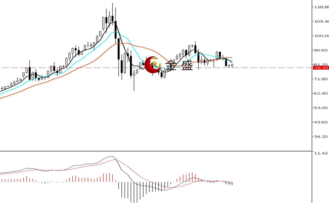 前一个交易日,白盘时段,银价延续下行,价格承压85美元一带震荡走低,午后有所反扑。晚盘时段,行情加速下挫,一小时走低三美金,多头失守80美元关口,盘中最低至79.39美元,日图收阴线。均线系统收敛向下拐头,价格运行在其下方。MACD指标快慢线零轴附近运行,做空的动能为主。白银周线两连阴,形成孕线结构。价格回落至近两周盘整结构的下轨,短期关注79美元一带的得失。不能有效跌破,则继续震荡。操作上高抛为主,低吸为辅。