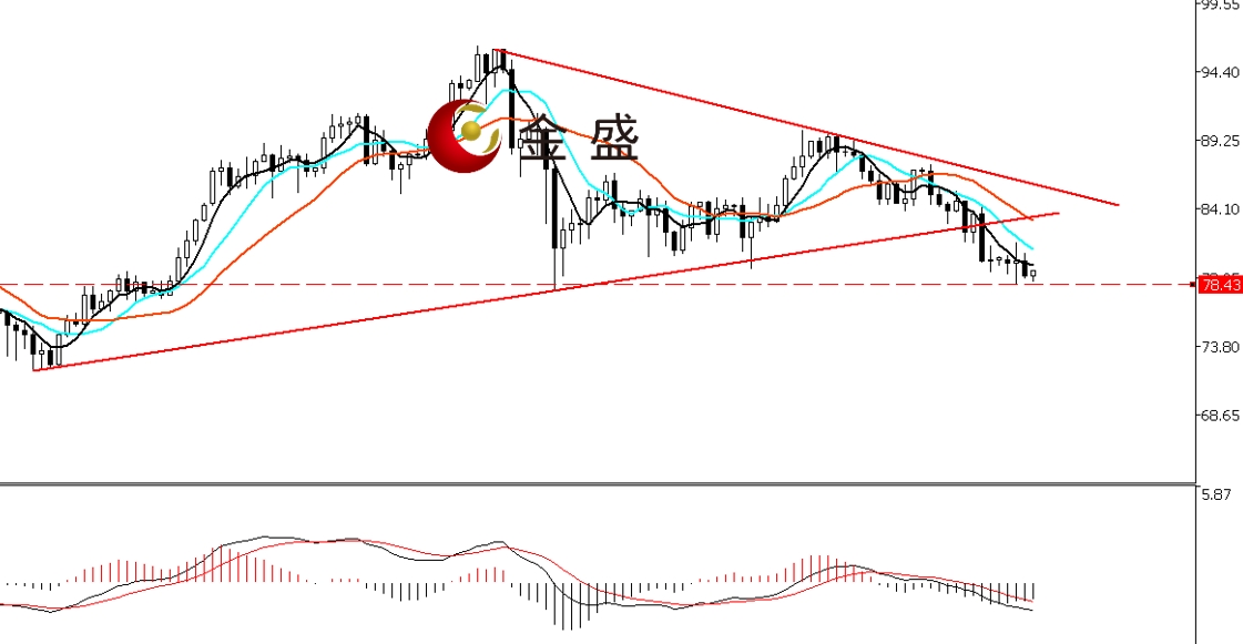 前一个交易日,白银走势与黄金类似,价格白盘弱势震荡,晚盘加速走低,盘中一度失守80美元关口,最终收跌3.97%。今天早盘行情短暂跳水,一小时下挫三美金,午后围绕80美元关口横盘整理。四小时图,均线系统收敛向下拐头,对价格反弹形成压制。MACD指标快慢线零轴附近现死叉,做空的动能增强。白银走势形成图示收敛三角形,价格跌破形态下轨,走势逐渐转空。短期关注水平支撑79美元一带的得失。不能有效跌破,则继续震荡。操作上高抛为主,低吸为辅。