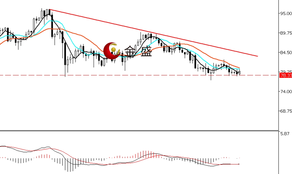前一个交易日,白银走势与黄金类似,价格先涨后跌走倒A字型,多空围绕80美元一带震荡。今天日内行情先跌后涨走V字型,多空博弈的空间进一步收窄。四小时图,均线系统不断收敛,布林带中轨对价格反弹形成压制。MACD指标快慢线零轴附近走平,做空的动能衰竭。白银走势形成图示下降三角形,价格回落至形态下轨附近。周内走势构成78—82的箱体结构,短期走势方向不明,等待市场打破盘整区间。操作上高抛为主。