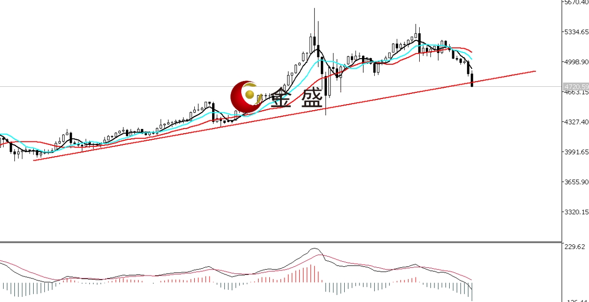 前一个交易日,美联储维持利率不变,美国PPI数据全线超预期。美指再度冲上100关口收阳。黄金早盘横盘整理,午后大幅下挫,当日波动近两百美金收阴线。今天日内行情延续弱势,价格逼近4700美元一带。日图周期,均线系统拐头向下,对价格反弹形成压制。MACD指标快慢线零轴附近现死叉,做空的动能为主。黄金跌破五千关口,出现强势单边走低。价格刺破图示的上行趋势线。近两日下行空间超三百美金,短期跌幅偏大,日内关注4700美元一带的得失,操作上不追空,等待小时级别止跌尝试博弈反弹。