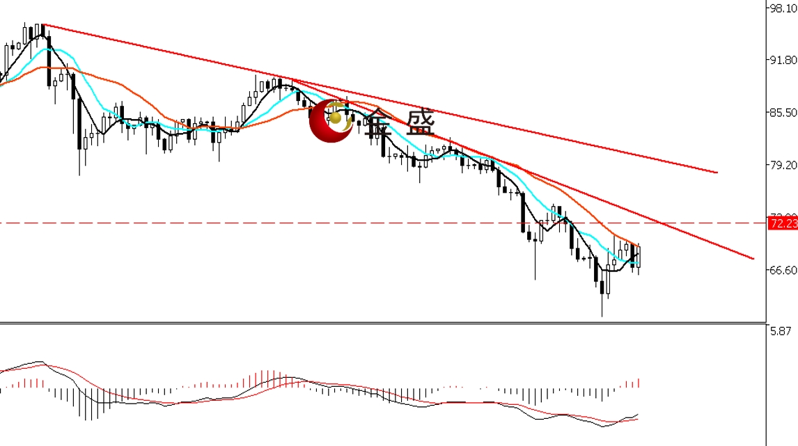 前一个交易日,白银走势与黄金类似,白盘行情持续下挫,盘中跌幅超10%,随着中东局势缓和,银价强势反扑,多头收复当日全部跌幅,最终收十字星。今天日内行情回踩66美元一带止跌回升,午后价格重返70美元关口。四小时周期,均线系统收敛走平,价格围绕其震荡。MACD指标快慢线零轴下方现金叉,做多的动能为主。金融市场恐慌情绪缓解,白银将迎来超跌反弹走势。价格形成下行趋势,短期关注加速趋势线72美元一带的压力,操作上低吸为主,高抛为辅。