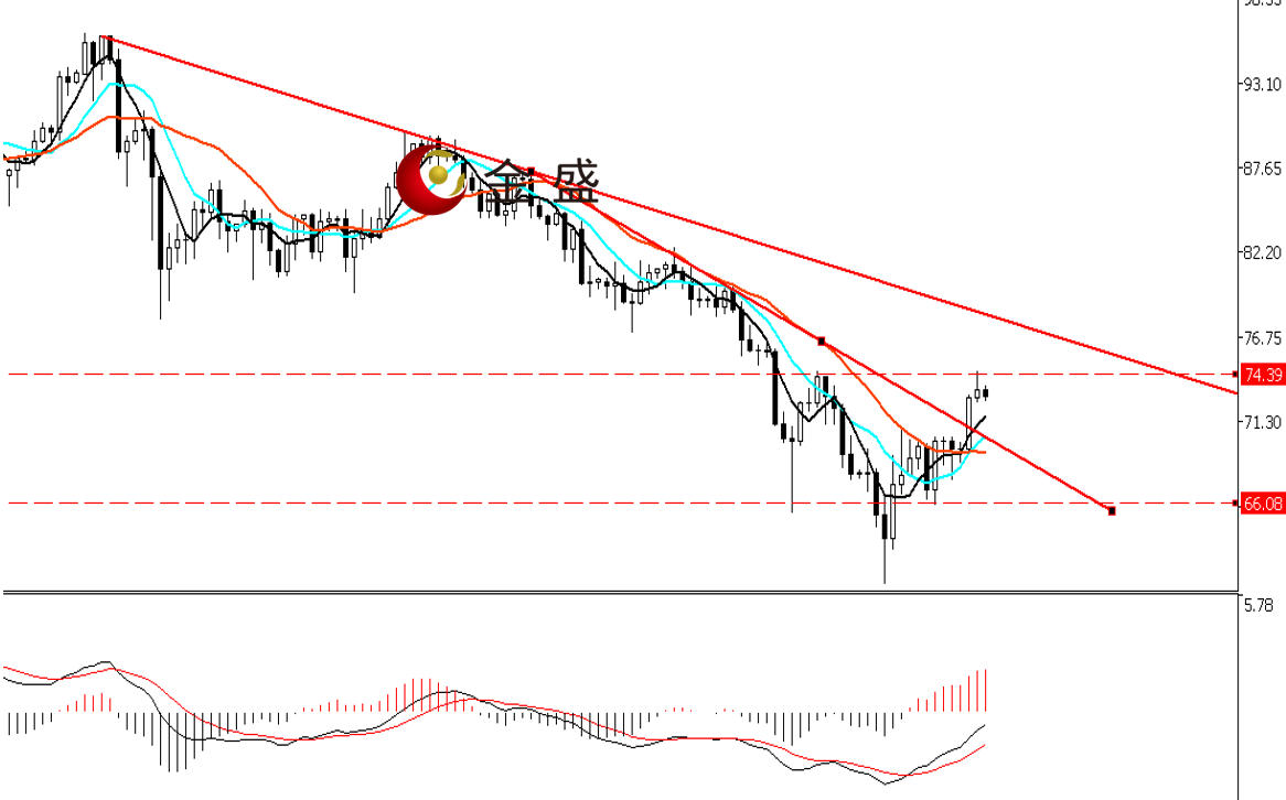 前一个交易日,白银走势与黄金类似,行情运行在周一的K线内,价格先跌后涨走V字型,多头受阻于70美元关口,日图收阳线。今天早盘行情突破昨日高点连阳加速上行,午后有所调整。四小时周期,均线系统收敛向上拐头,运行在价格下方形成支撑。MACD指标快慢线零轴下方现金叉,做多的动能为主。白银突破加速下行趋势线,价格来到前一波下跌的起点75美元附近,技术形态类似头肩底雏形,短期关注此水平压力位的真假破位。