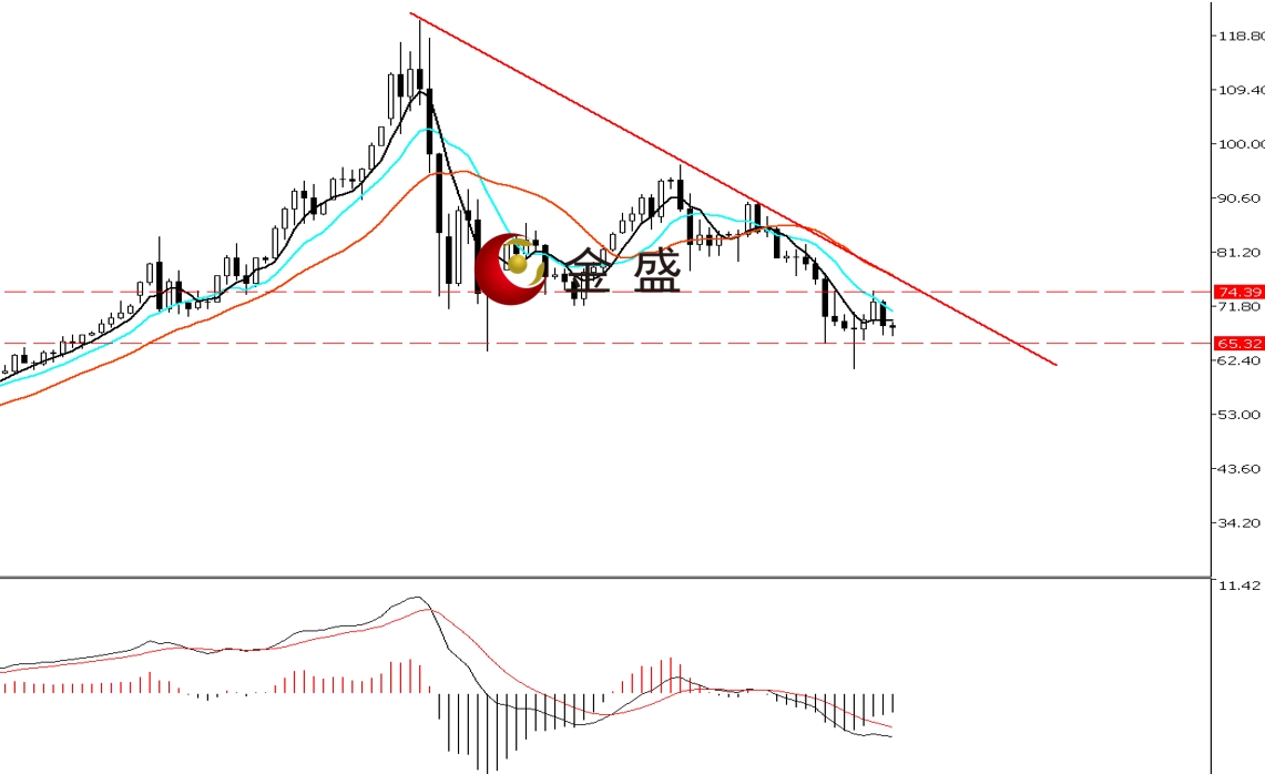 前一个交易日,早盘时段,白银震荡下行至70美元一带横盘休整数小时,午后一小时下挫逾两美金,多头回吐周三全部涨幅。晚盘时段,行情下行至日内低点66.88美元后弱势反抽,日图收阴线。均线系统收敛向下拐头,压制价格反弹。MACD指标快慢线零轴附近现死叉,做空的动能减弱。白银日图形成阴包阳结构,表明第一波连续三天的反扑结束。短期或二次回踩确认支撑区,即行情可能要进入超跌反弹后的盘整,操作上高抛低吸。