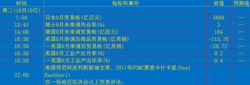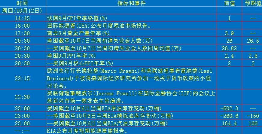 重点关注数据:美国10月6日当周API原油库存(万) 欧元区8月工业产出月率 美国10月7日当周初请失业金人数 美国10月6日当周EIA原油库存