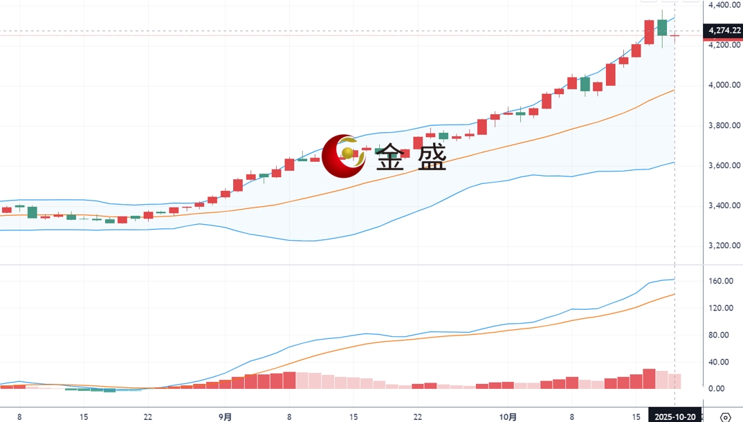 现货黄金上周五(10月17日)亚市早间开盘于4327.90美元/盎司,最高4379.94美元/盎司,最低4186.05美元/盎司,收盘4350.92美元/盎司,全天波幅约153美金,当日跌幅约1.74%。
