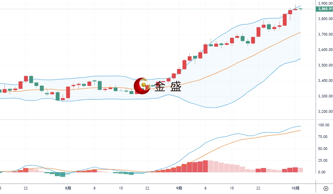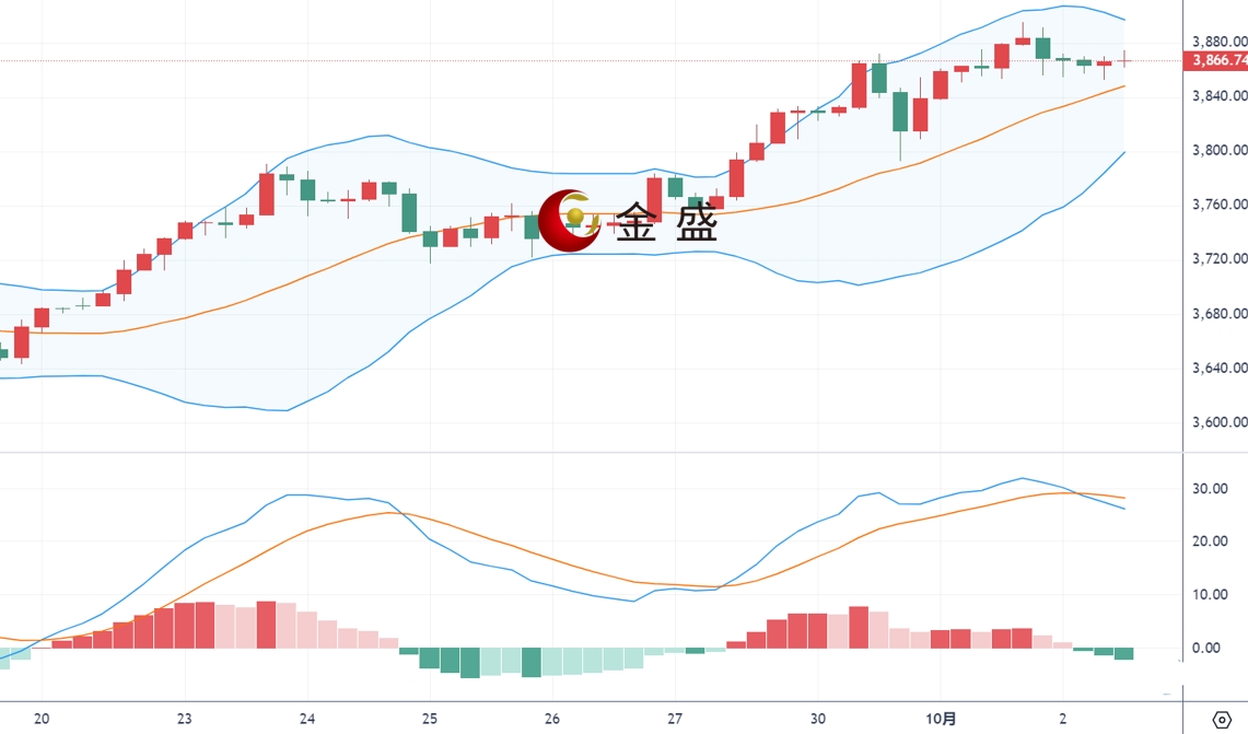 从日线图来看,现货黄金上一交易日冲高至3895一线后反复承压回落,美盘回吐欧盘全部涨幅,日线收出较长上影线,高位存在明显的抛压。布林带大开口,MACD指标金叉向上,多方继续占据优势,黄金从历史高点遇阻回落,展开高位震荡,对美联储进一步降息的预期,以及美国政府停摆危机强化避险需求,继续为金价提供支撑。不过黄金在连续冲高之后,短线存在调整需求。