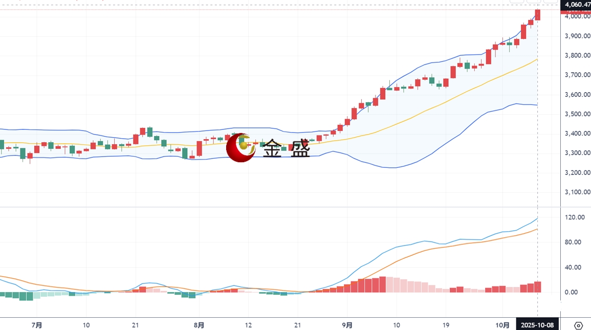 现货黄金周三(10月8日)开市于3984.89美元/盎司,盘中首次突破每盎司4000美元,一度刷新历史记录高点至4040美元,美国政府停摆加剧经济不确定性,叠加市场对美联储进一步降息预期升温,正成为推动资金涌入避险黄金的关键动力。此外,全球风险情绪小幅恶化背景下,不断升级的贸易与地缘政治紧张局势,以及各国央行的持续购金行为,共同助推了这波强势上涨。
