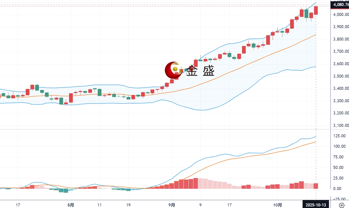 现货黄金周一(10月13日)开市于4001.97美元/盎司,盘中飙升至历史新高,一度刷新历史高点至每盎司4079美元,由于短期市场避险情绪进一步升温,叠加贸易不确定性扰动,支撑金价继续走强。金价今年已累计上涨54%,受多重因素支撑,包括地缘政治风险、央行购金、交易所交易基金(ETF)资金流入、美国降息预期以及贸易关税担忧。特别是特朗普宣布自11月1日起对华输美产品加征100%关税,并对关键软件实施出口管制,进一步加剧市场紧张情绪。