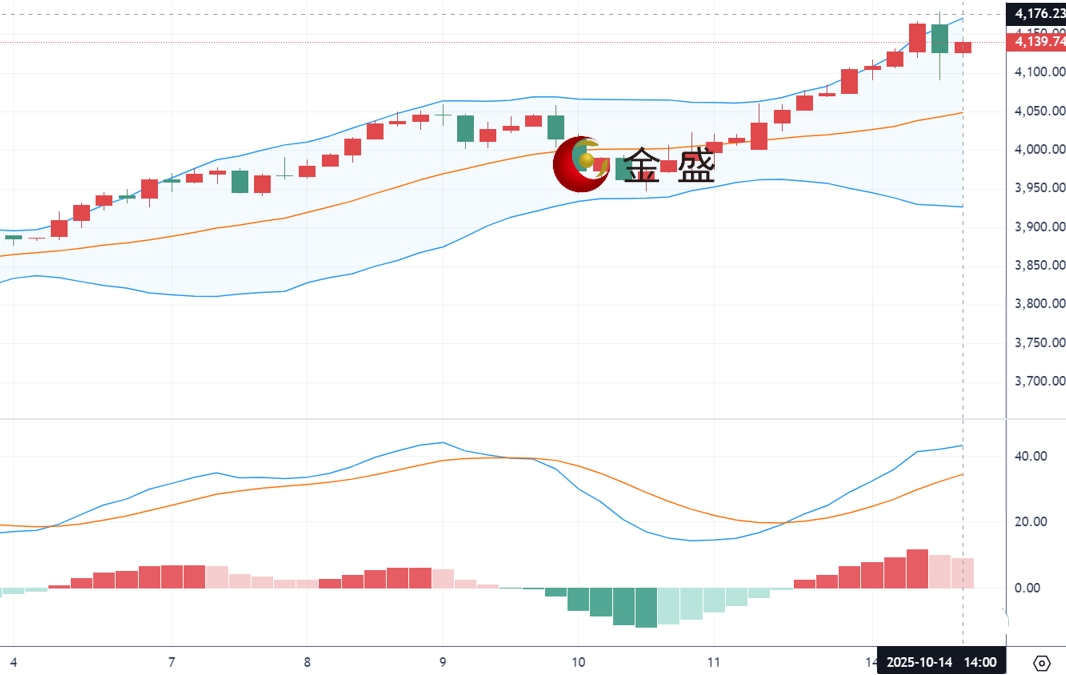 从四小时图来看,现货黄金上一交易日早盘在4110区域一路破高,欧盘前夕至4180区域后突然迎来跳水,最低一度跌至4090区域,后企稳回归多头。今日早盘黄金多头于4140区域企稳再次发力,截止目前创下4218美元历史新高,继续保持上升趋势,短期表现十分强势。MACD金叉放量中,布林口呈现放大形态,行情目前高位震荡且有继续冲高的迹象,多头强势上涨不言顶,操作上以回踩做多为主,上方关注4230-4240区间阻力,下方关注4100一线支撑。