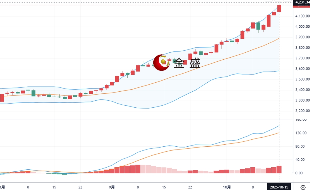 现货黄金周三(10月15日)开市于4143.88美元/盎司,盘中延续强劲涨势,攀升至每盎司4200美元附近的历史高位上方。市场对美联储降息的预期持续升温,目前市场普遍预期,美联储在10月及12月各降息25个基点的概率极高,叠加美中贸易紧张局势再度浮现,共同提振了黄金的避险吸引力。