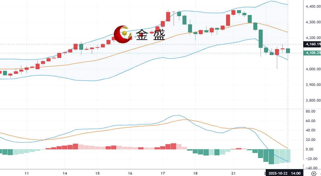 从日线图来看,现货黄金上一交易日从4382一路下跌至4080附近,下跌300美金再度刷新历史最大跌幅,日线录得大幅阴线,探高回落吞没前期大阳,打破了短期的强势格局。黄金连续三个交易日,在4380美元附近上涨遇阻,短期存在进一步回落的风险。今日早间黄金急跌到4004附近,随后又迅速回升100多美金,MACD双线钝化粘合;日K连阴向下概率较大,操作思路以反弹空为主。