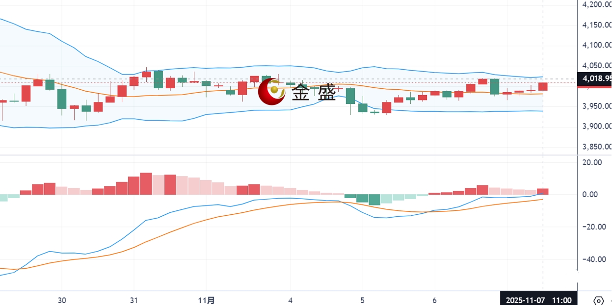 从四小时图来看,现货黄金上一交易坐上“过山车”,其在欧盘时段一度重回4010美元上方,但至美盘前,金价大幅跳水,随后抹去日内全部涨幅并转跌;金价在布林中轨上方运行,布林带处于收缩震荡,MACD指标处于零轴稍下位置徘徊,价格触及上轨再度承压,此前的弱势下探未能进一步破低下行,短线进入收缩震荡当中,目前价格升破4000关键阻力,K线也开始慢慢站上短周期均线倾向于在短期走势上维持偏强一些走势,操作上建议低多交易思路。