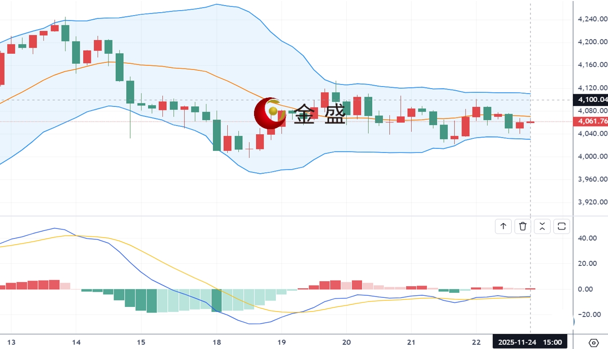 现货黄金周一(11月24日)开市于4070.68美元/盎司,盘中上扬至4077美元附近随后再次回落,但缺乏后续动能。因美联储官员暗示未来仍可能降息,使市场对12月政策会议的降息押注显著升温。同时,俄乌冲突稍有缓和的消息可能削弱风险溢价,进一步抑制避险黄金多头动能。