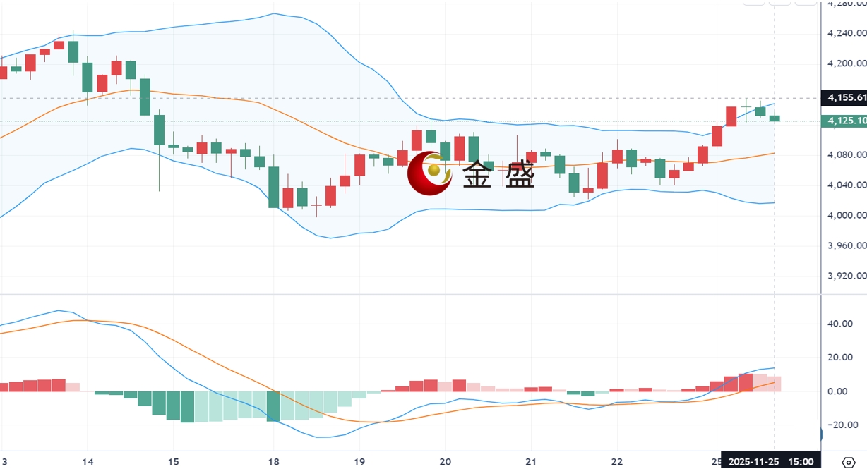 从四小时图来看,现货黄金上一交易日早盘测试4040一线后持续震荡走高,在凌晨时段冲高并冲破4100-4110一下震荡区间阻力,随即再度冲破4130的上周高点,当前黄金处于高位整理,价格运行在布林带中轨上方,今日黄金早盘自4122一线拉高并破高,MACD动能柱由空转多,快慢线向上发散,短期技术结构偏向多头延续,但需警惕回撤风险,上方关注4160-4170区间阻力,下方关注4100-4090区间支撑。