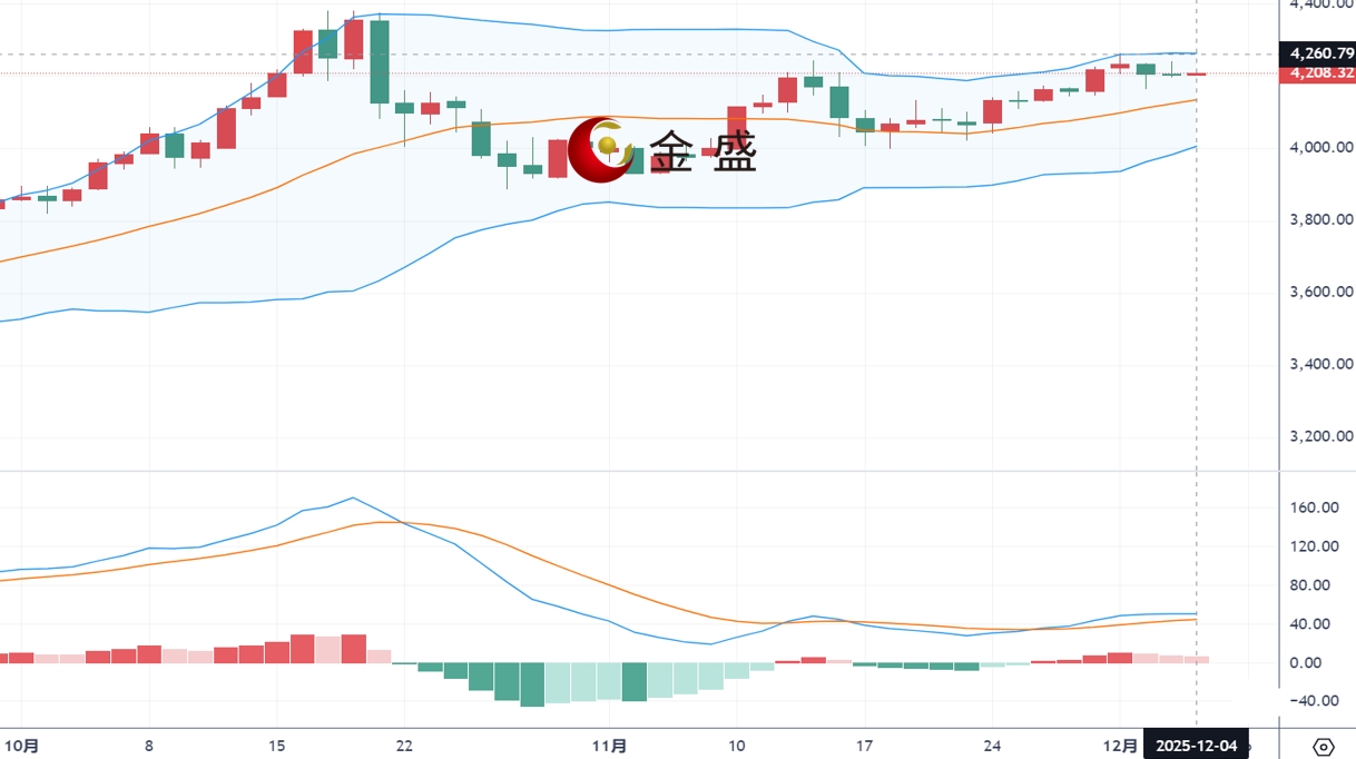 现货黄金隔日基本持稳,白银则再创历史新高,受美国疲软的民间就业数据提振市场降息预期。最新公布的ADP就业报告显示美国11月私营部门就业岗位意外减少,这增强了市场对美联储可能在下周政策会议上降息的预期。根据芝商所FedWatch工具,交易员目前押注下周降息的概率接近90%。截至目前,现货黄金窄幅震荡,最高触及4224.96美元/盎司,最低至4195.31美元/盎司。