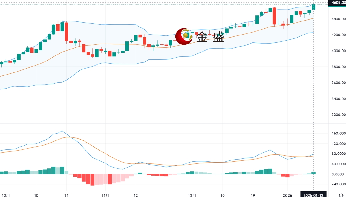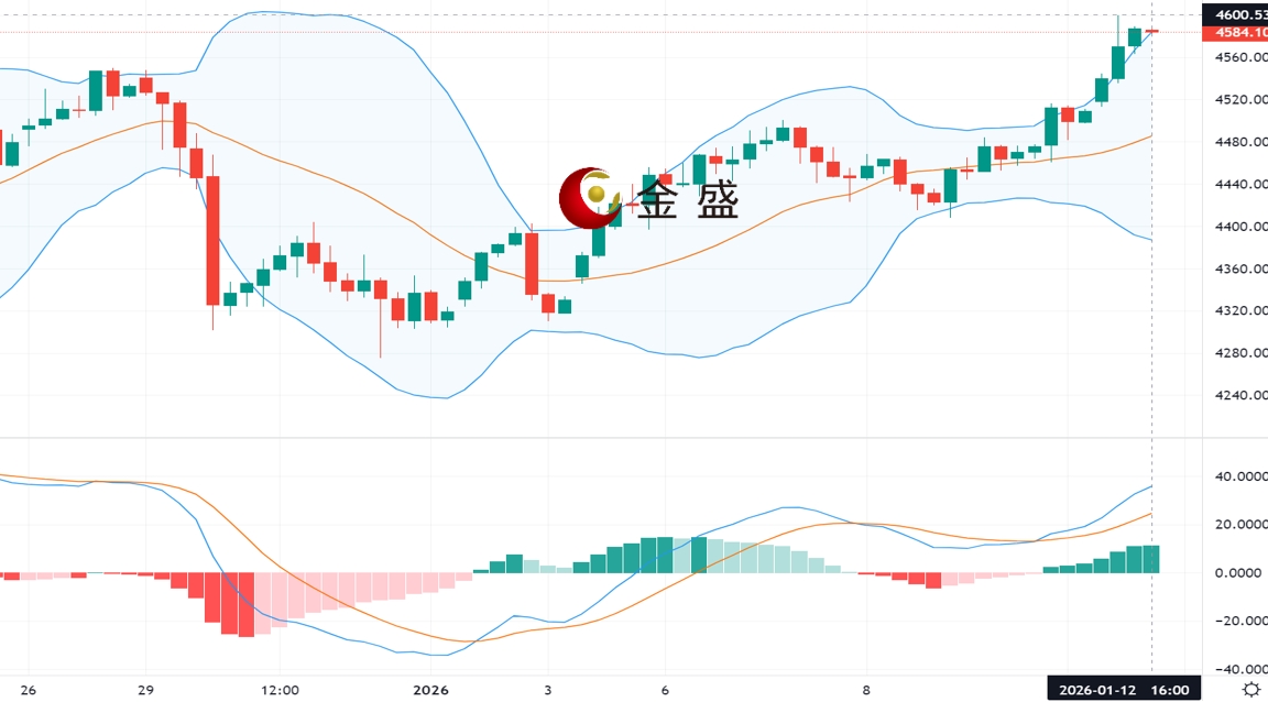 从四小时图来看,现货黄金上一交易日再度收涨,今日周一黄金开盘大幅拉高,一度冲至4600美元/盎司,创下历史新高,随后因部分投资者获利了结而小幅回调。均线多头排列,布林带呈放大形态,金价依托布林上轨运行,MACD金叉放量运行,上行结构良好,后市延续看涨,日内操作建议回踩做多为主,但勿高位追多。上方关注4610-4620区间阻力,下方关注4560-4540区间支撑。