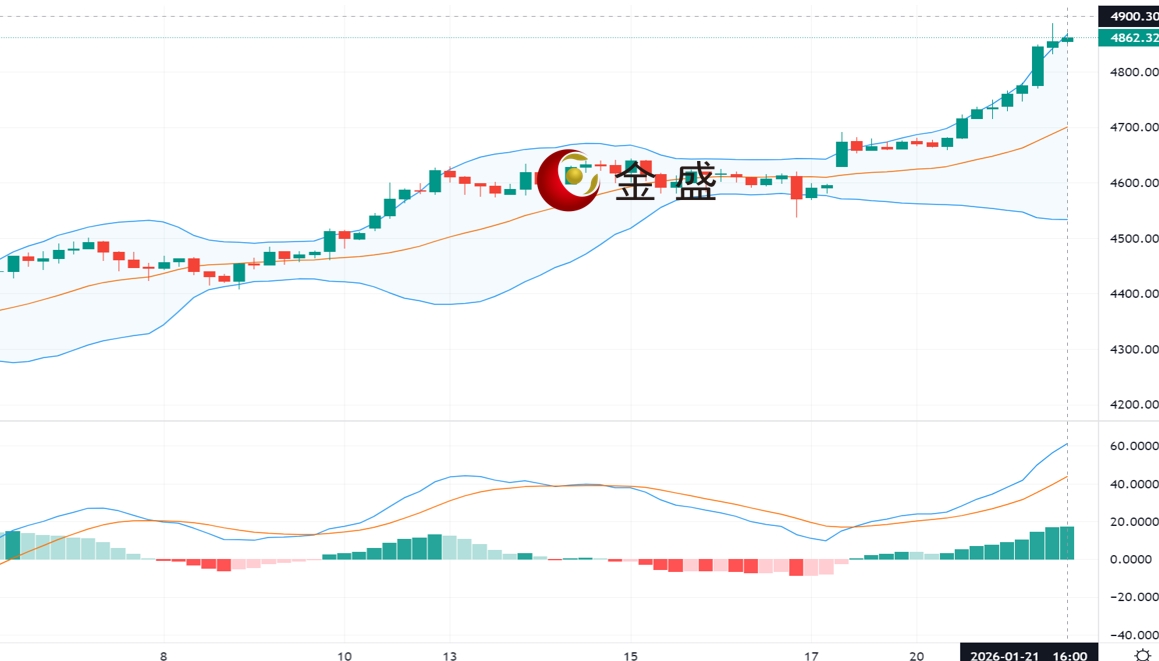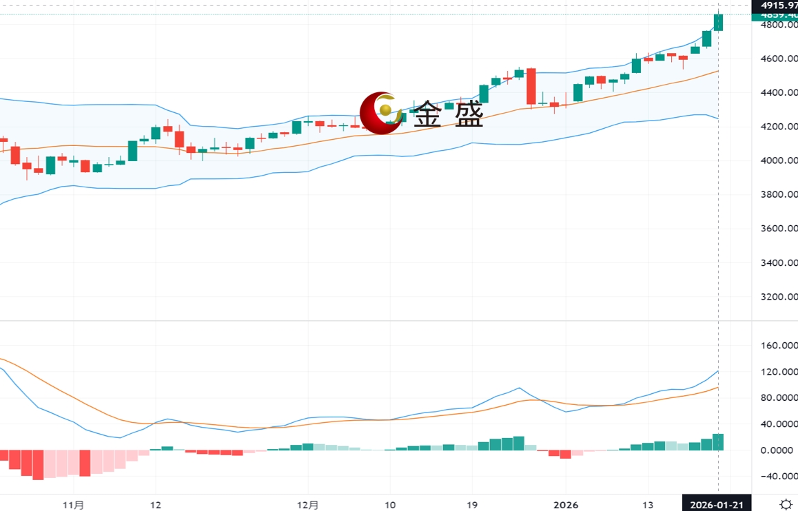 现货黄金周三(1月21日)开市于4737.39美元/盎司,盘中延续涨势,历史上首次突破4800关口,一度上涨至4888.03美元/盎司。近期围绕格陵兰岛的地缘政治风险成为市场关注焦点。美国总统特朗普近日多次就格陵兰岛问题发表强硬言论,包括表示控制该岛“没有回头路”等,引发北约内部关系紧张,推升避险情绪。目前处于情绪溢价阶段,短期技术层面多头稳固,但波动率有所增加,谨防高位宽幅震荡。