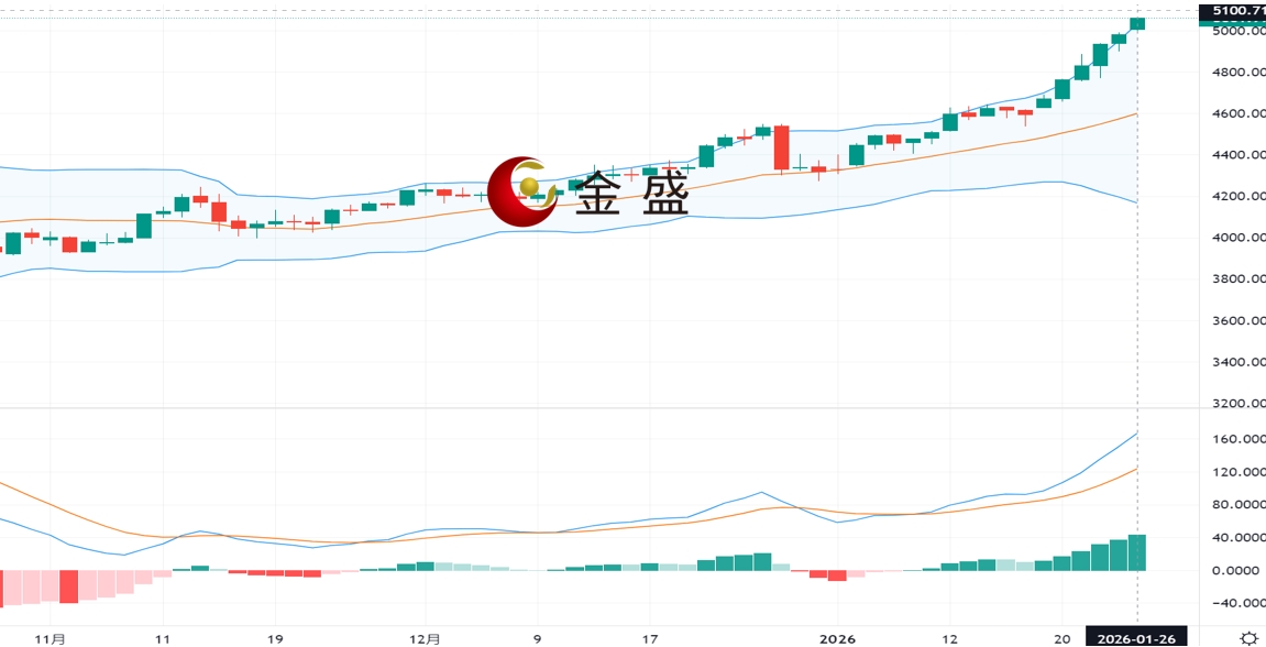 现货黄金上周五再创新高,距离5000美元仅一步之遥,最终收涨;黄金今日周一开盘持续走高,首次突破每盎司5000美元关键关口,一度创下历史新高至5065.71美元/盎司。此轮上涨主要受地缘政治风险升温推动,尤其美国与北约在格陵兰问题上的摩擦加剧了市场对金融及地缘格局不确定性的担忧。截至目前,现货黄金触及5065.71美元/盎司的高点,最低至4978.49美元/盎司。