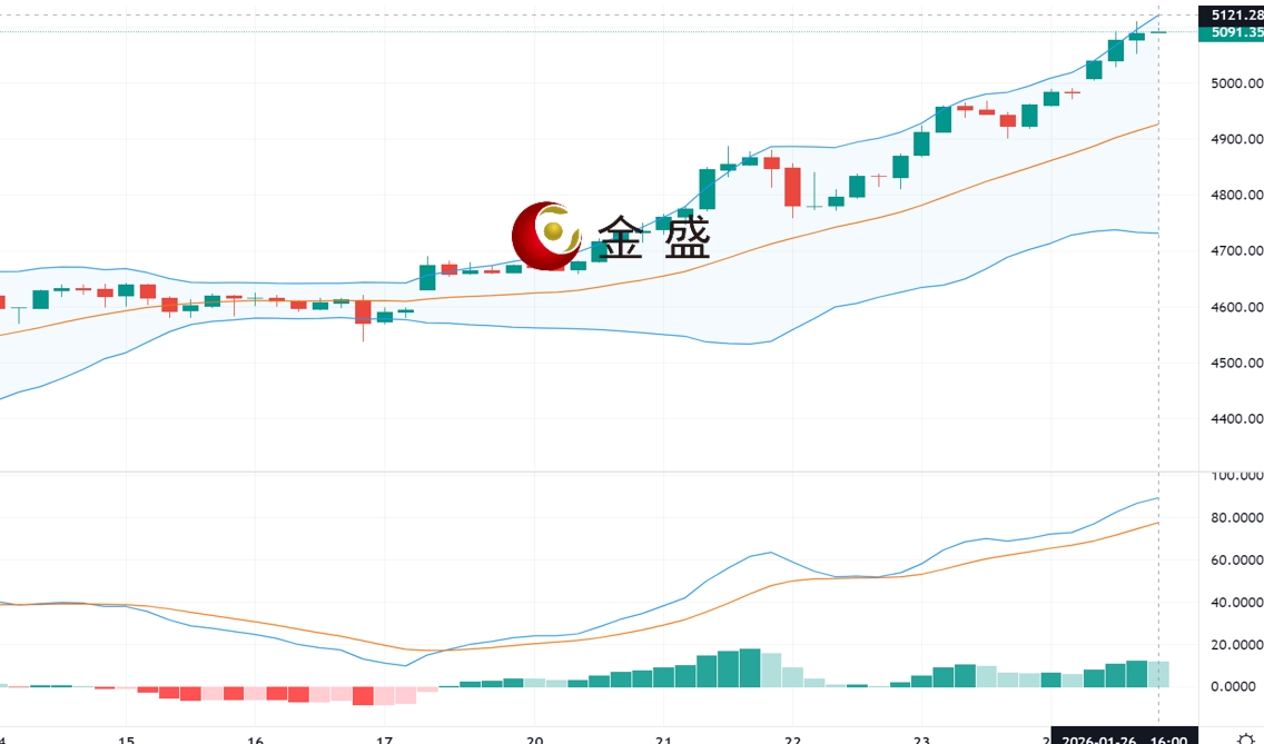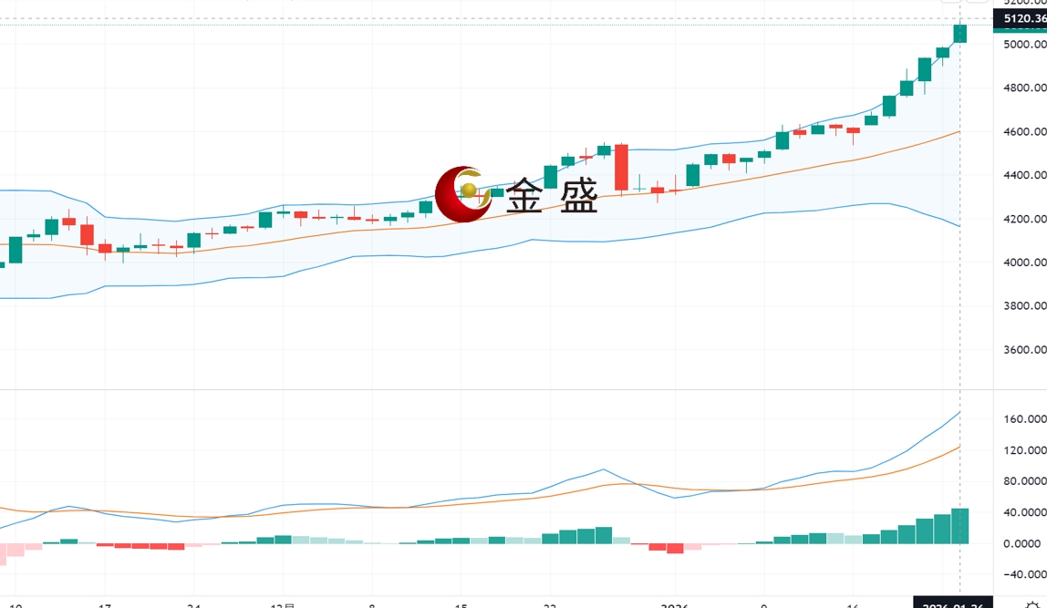 现货黄金周一(1月26日)开市于5007.35美元/盎司,盘中延续强劲涨势,连续突破5000美元关口和5100美元关口,截止目前,现货黄金一度刷新历史高点至5110.68美元/盎司。美国与北约在格陵兰问题上的摩擦升级,加剧市场担忧。同时,俄乌谈判未取得突破,俄罗斯空袭导致乌克兰大规模停电,进一步推升避险情绪。市场还担心美国可能对伊朗采取军事行动。不过,金价短线涨幅较大,需要提防技术性回调行情。
